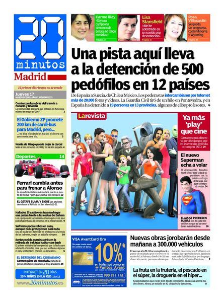 20 Minutes/20 minutos - Ya mas play que cine / Una pista aqui lleva a la detencion de 500 pedofilos en 12 paises - 1215 -