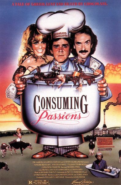 Sortie du film Consuming Passions avec Tyler Butterworth, Jonathan Pryce, Vanessa Redgrave, Freddie Jones, Sammi Davis, Prunella Scales , réalisé par Giles Foster.