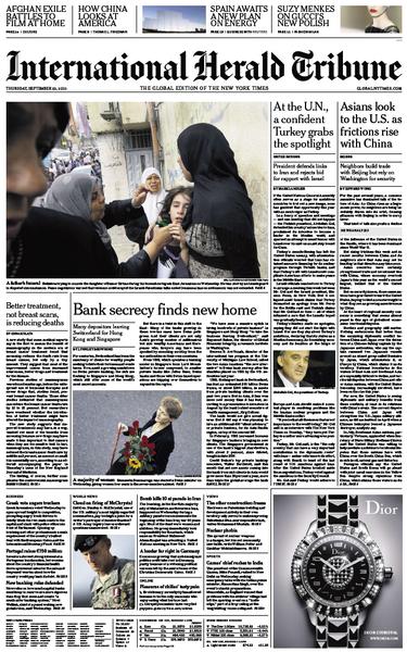 International Herald Tribune - - At The UN a confident Turkey grabs the spotlignt/ Funeral ofSamer Sirhan at East Jerusalem -