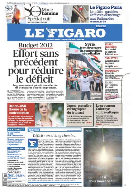 Publication de Le Figaro N° le Budget 2012 effort sans précédent pour réduire le déficit/ Banon-DSK / Syrie le mouvement de contestation se radicalise.