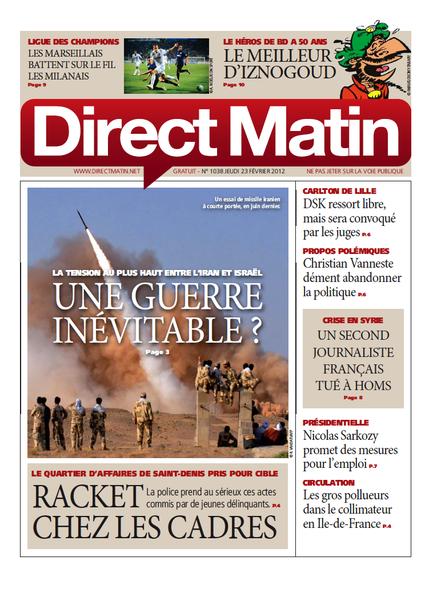 Couverture de : : Titre: Direct Matin N°: 1038- Sujet/Couv: La tension au plus haut entre l'Iran et Israël Date Parution: 23/02/2012