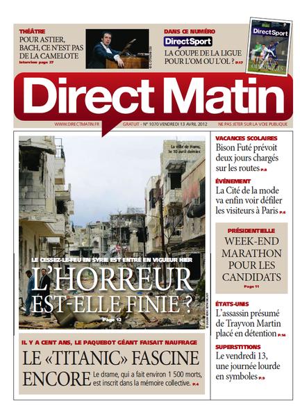 Couverture de : Titre: Direct Matin N°: 1070 Sujet/Couv: Cessez le feu en Syrie L'horreur est -elle finie? Date Parution: 13/04/2012