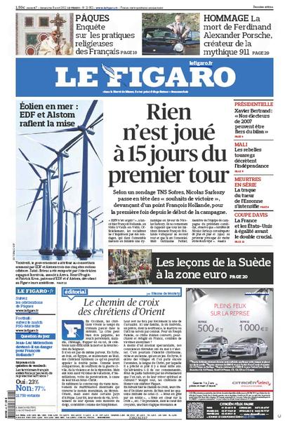 Couverture de : Titre: Le Figaro - N°: - Sujet/Couv: Eolien en mer : EDf et Alstom raflent la mise/ Rien n'est joué à 15 jours du premier tour Date Parution: 07/04/2012