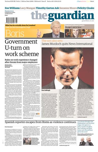 Couverture de : : Titre: The Guardian N°: - Sujet/Couv: James Murdoch quits news international Date Parution: 01 march 2012